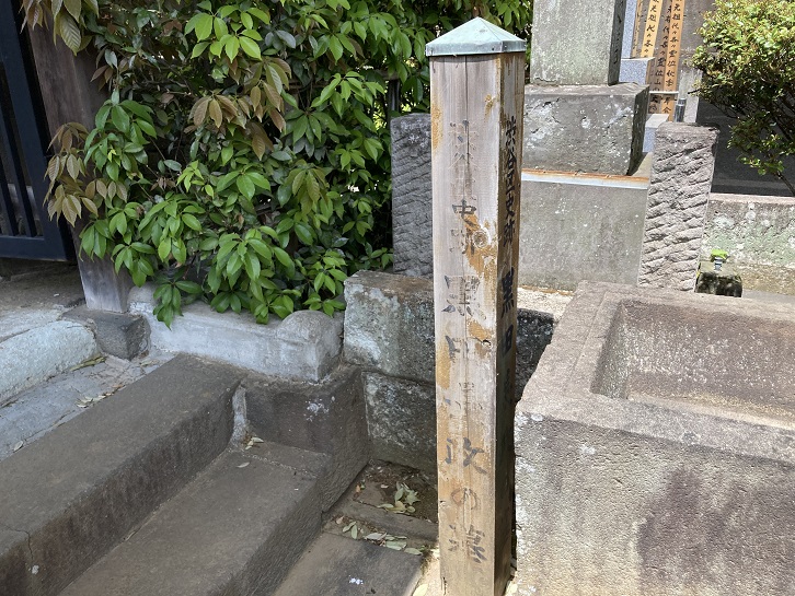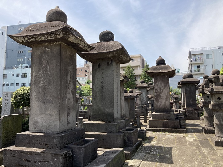 墓地に入りますと、入口の奥に明治三十五年建立の鼠塚があります。明治三十二年(1899年)から数年間にわたり日本国内でペストが流行したとき、感染源としてねずみが大量に駆除されたために、鼠の霊を供養して明治三十五年に建てられた珍しい動物慰霊碑です。犠牲となったねずみ達のおかげか、大正十五年(1928年)を最後に日本では今日までペストの発生は全くありません。鼠塚には3匹の鼠の絵も添えられています。碑の裏側には「数知れぬ 鼠もさぞや うかぶらむ この石塚の 重き恵みに」という歌も彫られています。