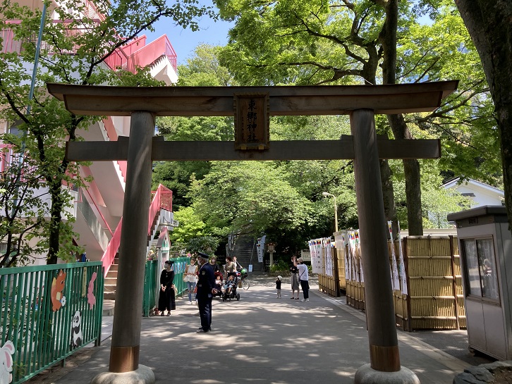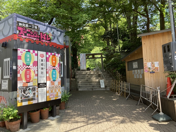 竹下通りの途中から東郷神社に抜ける細い路地があります。境内に続く階段の先には小ぶりながら鳥居も立っています。鳥居とは神社の入り口などにある建造物で、神様の世界と人間の世界を分ける境界と考えられています。鳥居の内側は神聖な神域とされ、鳥居をくぐる際には一礼するのが作法となっています。