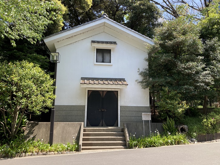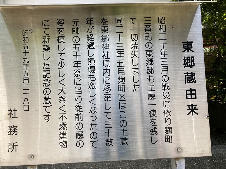 昭和二十年三月の戦災に依り麹町三番町の東郷邸も土蔵一棟を残して一切焼失しました。同二十三年五月麹町区はこの土蔵を東郷神社境内に移築して三十数年が経過し損傷も激しくなったので元帥の五十年祭に当り従前の蔵の姿を模して少しく大きく不燃建物にて新築した記念の蔵です。