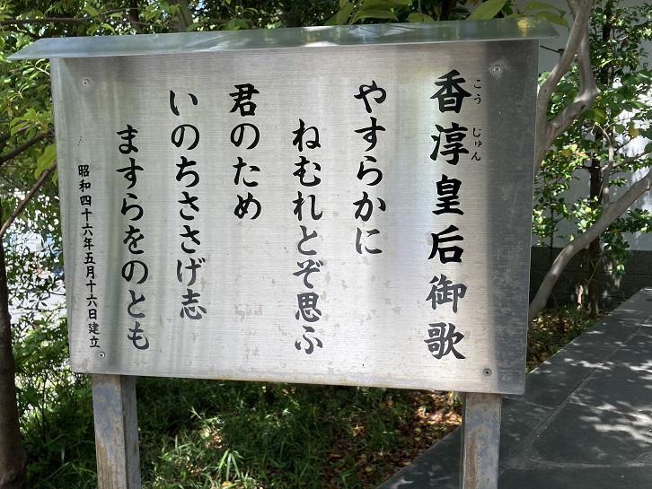 碑の脇には香淳皇后(昭和天皇の皇后)の御歌を記した碑板も立っています。「君のため」って、誰のためなのでしょうか?