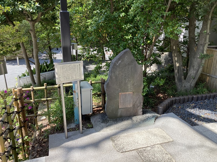 本殿のある境内から階段を下りたところに鳥居が立っています。祠はありませんが、この鳥居は築地の水交社(海軍将校の親睦団体)にあった水交神社の鳥居です。明治四十四年に建立され、曲折を経て昭和五十六年に東郷神社に寄贈されました。