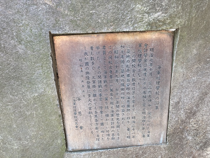 明治七年十月、芝山内天神谷に設けられた海軍會計學舎は幾度かその名稱を変え明治四十年に海軍經理學校となった。この間校舎も数度位置を変えて、明治二十一年に築地の松平樂翁公邸の浴恩園跡に移り、更に昭和七年同じ築地の隅田川河畔(現在の勝鬨橋右岸)に移築された。昭和二十年九月、七十一年間の歴史を閉じるまでの同校出身者は一萬名を超え海軍主計科の基幹要員として海軍戰力の一翼を担い輝かしい功績を挙げた。その間諸戰役事変に際會して國に殉じた者も数多く、又軍務を離れても各界各方面で活躍し我が國の興隆發展に多大の貢献をしている。