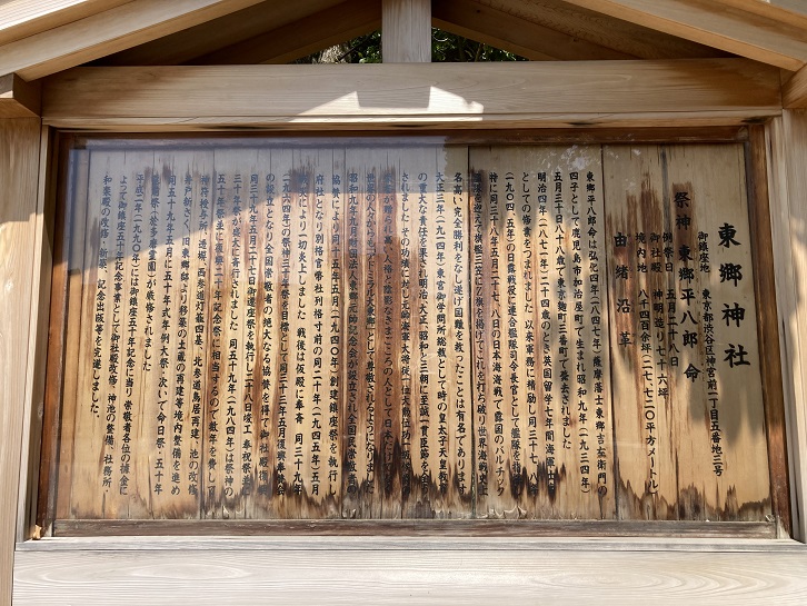 東郷平八郎命は弘化四年(1847年)薩摩藩士東郷吉左衛門の四子として鹿児島市加治屋町て生まれ、昭和九年(1934年)五月三十日八十八歳で東京麹町三番町で薨去(こうきょ:皇族または三位以上の貴人が死去すること)されました。明治四年(1871年)二十四歳のとき英国留学、七年間海軍士官としての修業をつまれました。以来軍務に精励し、同三十七年〜三十八年(1904年〜1905年)の日露戦役に連合艦隊司令長官として艦隊を指揮し、特に同三十八年五月二十七・八日の日本海海戦て露国のバルチック艦隊を迎えて旗艦三笠にZ旗を掲げてこれを打ち破り、世界海戦史上名高い完全勝利をなし遂げ、国難を救ったことは有名であります。大正三年(1914年)東宮御学問所総裁として時の皇太子天皇教育の重大な貴任を果され明治・大正・昭和と三朝に至誠一貫臣節を全うされました。その功績に対し、元帥海軍大将従一位大勳位功一級候爵の栄誉が贈られ高い人格と陰影なきまごころの人として日本だけでなく、世界の人々からも「アドミラル大東郷」として尊敬されるようになりました。昭和九年九月財団法人東郷元帥記念会が設立され、全国民敬者の協賛により同十五年(1940年)五月創建鎮座祭を執行し府社となり、別格官幣社列格寸前の同二十年(1945年)五月、戦災により一切炎上しました。戦後は仮殿に奉斎、同三十九年(1964年)の祭神三十年祭を目標として同三十三年五月復興奉賛会の設立となり全国崇敬者の絶大なる協賛を得て御社殿復興、同三十九年五月二十七日御遷座祭を執行し、二十八日竣工。奉祝祭並に三十年祭が盛大に斎行されました。同五十九年(1984年)は祭神の五十年祭並に復興二十年記念祭に相当するのて数年を費して神符授与所・透塀・西参道灯籠四基・北参道鳥居再建・池の改修・井戸新さく・旧東郷邸より移築の土蔵の再建等境内整備を進め、同五十九年五月に五十年式年例大祭・次いて命日祭・五十年墓前祭奈(於多磨畫園)が厳修されました。平成二年(1990年)には御鎮座五十年記念に当り、崇敬者各位の據金(きょきん:ある目的のためにお金を出し合うこと)によって御鎮座五十年記念事業として御社殿改修・神池の整備・社務所和楽殿の改修・新築・記念出版等を完遂しました。