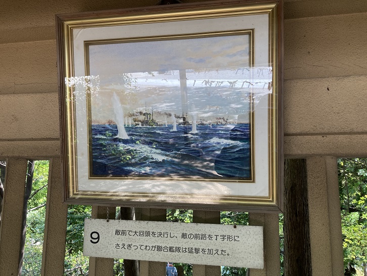 神社の境内を囲んでいる壁に、東郷平八郎の一生を描いた絵とその解説を記したプレートが年代順に掲げられています。全部写真に撮ったつもりなんですけど、6番が抜けていますねぇ。