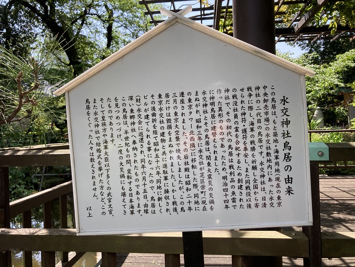 この鳥居は、もと築地・海軍用地(現在の東京中央卸売市場)の水交社敷地内にあった水交神社の二代目の鳥居です。水交神社は、日清戦争に際し、海軍の戦勝を祈願し全国から寄せられた神符・護符を奉安し、また同戦役以後の戦没社員の霊を合祀するため創建された神社で、そ の初代の鳥居は戦利品の魚雷で作った異形のものであったため、明治四十四年に神明鳥居に建替えられました。水交神社とその鳥居は、関東大震災の災禍をまねがれ、昭和三年に水交社が芝区栄町(現在の東京タワー北西隣)に移転した際、同地に遷座されました。その后社殿は昭和二十年三月の東京大空襲で焼失しましたが、この鳥居だけは毀損をまぬかれました。しかし戦後、東京水交社の建物と共に進駐軍に接収され、その後曲折を経て昭和五十六年、同地に新しくビルが建てられる事になったので、鳥居は(財)水交会に返還され、同年六月十五日、由縁深い東郷神社へ奉納されたものであります。この鳥居は、半世紀もの間、変転する日本海軍を見つめつづけ、二度の大災禍にも堪えてきたものであります。そして皇族方や海軍大臣以下多くの武官文官、また水交神社で結婚式を挙げた方など、この鳥居をくぐった人々は数えきれません。