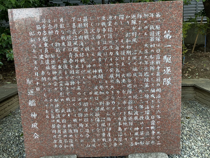 第一駆逐隊は日露戦争直前の明治三十六年(1902年)我国最初の駆逐隊として編成され、日露戦争に参加ののち、大正九年迄艦隊第一線で活躍後、一旦解隊された。大正十一年(1922年)改めて第一駆逐隊が野風・沼風で編成され、続いて波風・神風が加わり、昭和初期まで聯合艦隊の新鋭駆逐艦として活躍した。その後は主に大湊(むつ市)を基地としてオホーツク海及び千島列島カムチャッカ半島沿岸の漁業保護に尽力、その発展に大きな力となった。大東亜戦争では北はアッツ・キスカ方面から南はインド洋ジャワ方面まで幾多の戦闘に参加野風・沼風は勇戦空しく沈没したものの神風・波風は一部損傷を受けたが最期迄戦い抜き、神風はシンガポールにおいて、波風は瀬戸内海で終戦を迎えた。その間渡辺保正司令・山下喜義沼風艦長外五百四十名の方々が国に殉じられた。この燈籠は青春を国に捧げ、若くして戦いに殉じた勇敢な戦友と、最後まで海上で戦い抜き、戦後の復興に尽力、物故した乗員の霊を慰め、我が国永遠の平和を念願して、駆逐艦神風会が駆逐艦波風会有志及び司令各艦乗員御遺族、ならびにこの主旨に賛同の方々の協力をえて建立・奉納したものである。