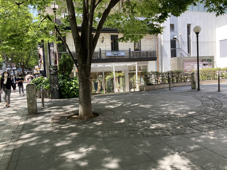 東郷神社を出て明治通りを渡り、「HARAJYUKU ST」という名前の細い通りに入っていきます。その通りと交差する道路は旧渋谷川の跡に造成されたものです。今では道路の両側に時代の先端をいくアパレル関係のお店が建並んでいて、表参道や竹下通りとは一線を画しています。注意して見ると、道路は緩やかにうねっています。川の流路がそのまま道路になったような感じです。
