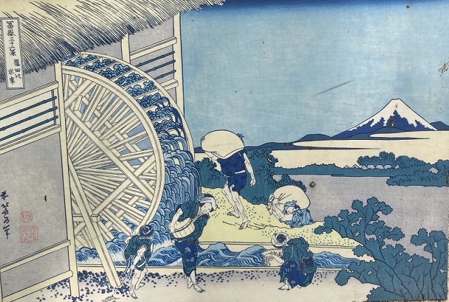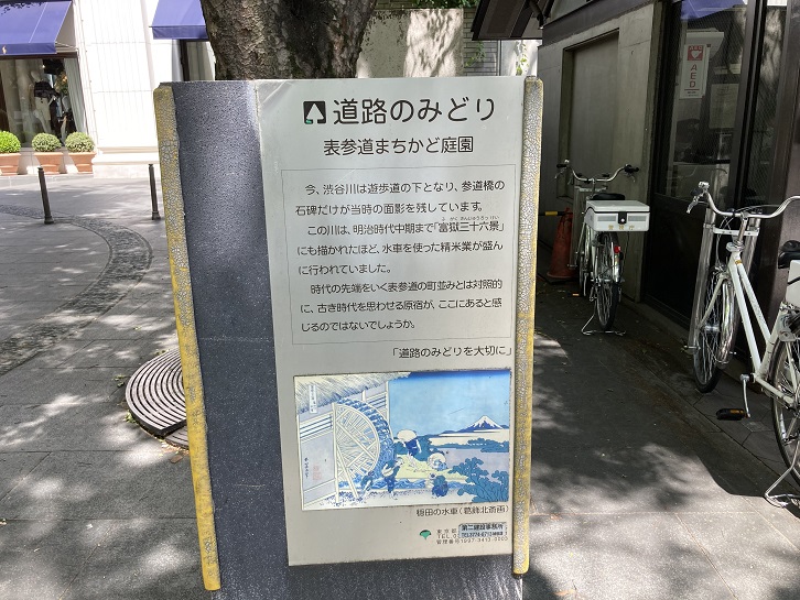 庭園には旧渋谷川の案内板が立っています。葛飾北斎の画には「穏田の水車」というタイトルが付いています。周りの人物と比べても数倍巨大な水車が勢いよく回っていますので、昔の渋谷川の水流はかなりなものだったのでしょう。