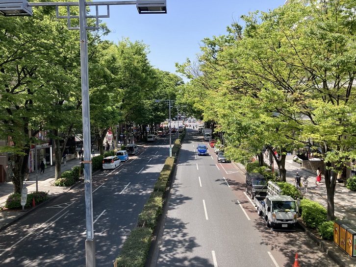 表参道の通りを歩道橋で渡ります。正式には、東京都道413号赤坂杉並線と呼ばれているのだそうです。新緑の緑が風景に合っています。