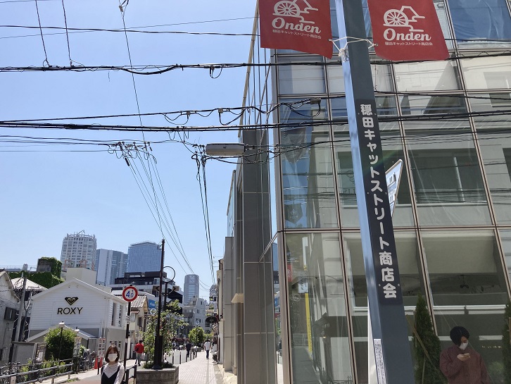 道路を渡った先に旧渋谷川の跡に造られた遊歩道が続いています。「穏田キャットストリート」という名前が付けられていますが、これには理由があります。かつては穏田川と呼ばれて水車を回していた渋谷川ですが、「穏田」という地名の由来は徳川幕府が開かれた400年近く前に遡ります。家康は信頼していた伊賀忍者の一族郎党をこの辺りに住まわせました。忍者の隠れ里ということで「隠田(おんでん)」と呼ばれましたが、いつからか「穏田」という字を使うようになりました。当時はのどかな農村で、穏田には渋谷川の水流を利用した水車があちこちにあり、その光景はさきほど見た葛飾北斎の富嶽三十六景のひとつの「隠田の水車」として描かれています。昔はまだこの界隈は住宅街で子どもたちが大勢いましたが、周辺に公園がなかったために、子どもたちの遊び場をつくろうと現在のキャットストリートがある場所に滑り台やブランコ・砂場などが設置されました。やがて公園にはどこからともなく野良猫が集まり始めました。周辺の住人が餌を与えたために猫の数は増え続け、しだいに猫だらけの公園になっていきました。「キャットストリート」という名称の由来には諸説ありますが、そのように多くの猫が集まっていたからというのが最有力の説とのことです。