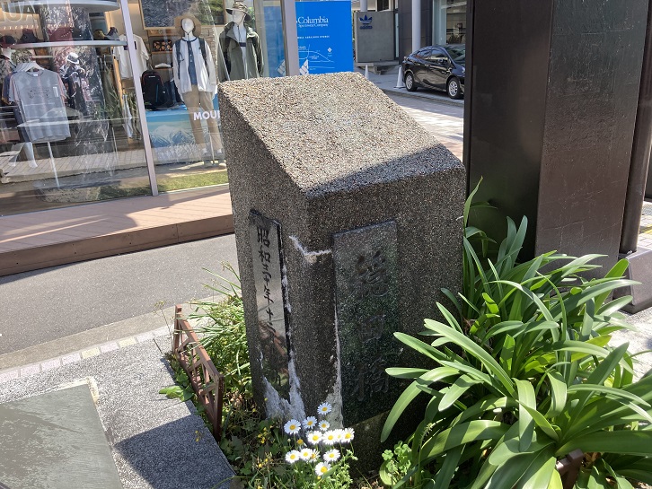 道路の先端は表参道のメインストリートと交差します。その地点に「表参道まちかど庭園」と名づけられた小さなスペースが設けられています。ここには旧参道橋の親柱が二基残されています。親柱の間隔が川幅としますと、ちょっと広いように思います。それに先ほど通った旧渋谷川跡の道路とちょっとずれているような。