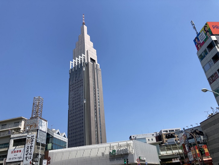 スタート地点の代々木駅西口から歩き始めます。代々木駅の西口周辺は雑多な飲食店や専門学校などが建並んでいますが、東口には高島屋タイムズスクエアとか紀伊國屋・東急ハンズなどの大型店があり、駅の東側と西側で対照的な街の雰囲気となっています。そんな中で東口駅前に建つNTTドコモ代々木ビル(通称ドコモタワー)は、その外観と高さで異彩を放っています。旧国鉄の新宿貨物駅の跡地に立地し、高さ240mの超高層ビルで、都内ではミッドタウンタワー・虎ノ門ヒルズ・東京都庁第一本庁舎に次いで4番目の高さを誇っています。外観はエンパイアステートビルなど、1930年代に建てられたニューヨークの摩天楼を思わせるデザインで、「新宿のエンパイアステートビル」と呼ばれています。建物自体は通常のビルでいえば地上50階ほどの高さに相当しますが、ビルとしての構造を持つのは全体のうち下半分程度(地上25階)までで、14階までがオフィススペース、15階から25階までは通信設備などが設置されている機械室になっています。残りの上層部はマイクロ波アンテナを設置するための尖塔になっていて、鉄骨に外壁が貼られているだけの屋根のない空洞です。いつも気になるのですが、頂上付近に工事用のようなタワークレーンが設置されています。普通は建物筐体の工事が終わったらクレーンは解体されるのですが、何故残されたままになっているのでしょうか?実は、このクレーンはデリックと呼ばれ、高さが32mあって、アンテナの方向などの修正や下階層からの機材の吊り上げに使われているのだそうです。ビルにデリック部分を含めると高さが272mとなり、東京スカイツリーと東京タワーに次いで都内で3番目に高い建築物となります。
