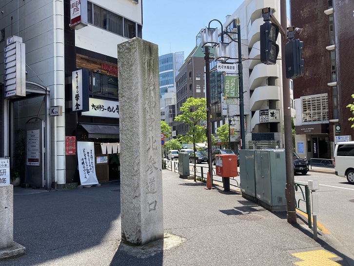 代々木駅は明治神宮の北参道口に当ります。この石碑は昭和四十八年(1973年)11月に建立されましたが、当時の明治神宮北参道への最寄り駅が代々木駅でしたので、駅前のこの場所に設置されました。