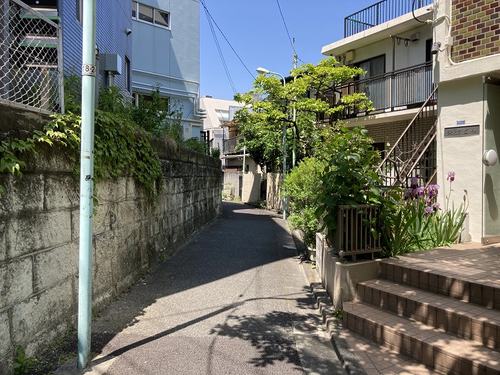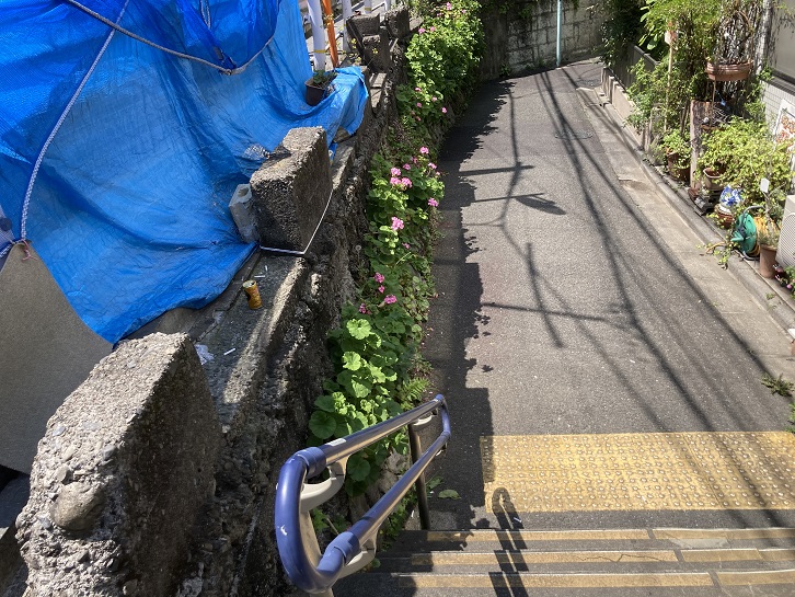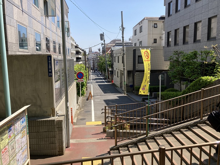 遂に春の小川の源流を見つけた!かと思いきや、左に入った道路の両側にはマンションが建ち並び水源のスも見当たりません。行きつ戻りつ何か痕跡はないかと探したのですが、それらしきものは何も見当たりません。諦めて突き当たりの階段を上って高台から今来た道を眺めてみます。何も見えませんね。と、今写真を拡大してよくよく眺めてみましたら、道路を曲ったすぐ先の電柱に「・・・」と何やら書いてあって、矢印が右に曲っています。ということは、左に曲って直ぐ先でもう一回右に曲る必要があったのです。恐らく、右に曲った先に春の小川の水源を示す何らかの案内板は標識があるのではないかと思います。残念!思うに、昔の春の小川は直線的に流れていたのでしょうけど、埋め立てた(暗渠化?)後で宅地を造成する際、マス型の道路ができたのではないかと思います。クランク状の水路って人工的にしか造れませんもんね。