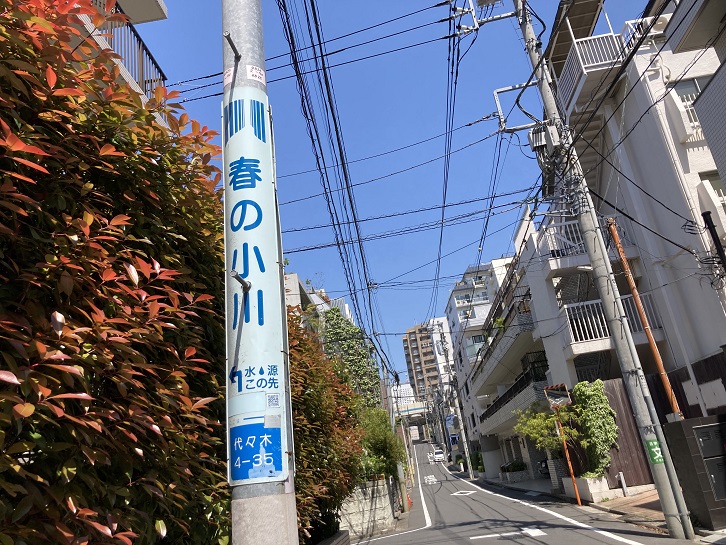 参宮橋公園から戻り、駅前の坂道を下って行きますと、郵便局手前で路地と交差します。そこを右手に入りますと、春の小川の流路跡になります。電柱には「春の小川 この通り」と大書きされた地番表示のプレートが貼り付けられています。その先の電柱にも同じプレートが貼付けられています。この標識を辿っていけば、春の小川の源流まで行けそうです。