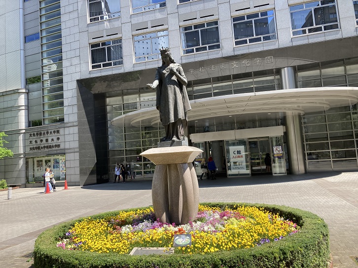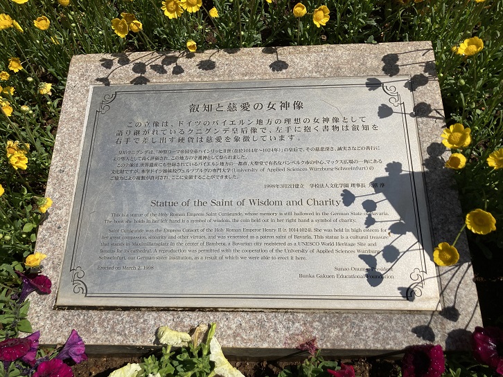 Saint Cunigunde was the Empress Consort of the Holy Roman Emperor Henry II (r. 1014-1024). She was held in high esteem for her great compassion, sincerity and other virtues, and was venerated as a patron saint of Bavaria. This statue is a cultural treasure that stands in Maximiliansplatz in the center of Bamberg, a Bavarian city registered as a UNESCO World Heritage Site and famous for its cathedral. A reproduction was permitted with the cooperation of the University of Applied Sciences Wurzburg Schweinfurt, our German sister institution, as a result of which we were able to erect it here.