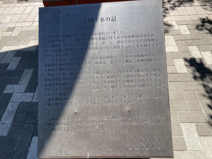 かつてこの地には、玉川上水が流れていました。玉川上水は、江戸城下の急激な発展に伴う水不足を解消するため、江戸幕府により承応三年(1654年)に、開削された人工の水路です。全長は、多摩川上流の羽村取水口から四谷大木戸に至る約43キロメートルです。この上水は、江戸市中への飲料水の供給という本来の目的のほか、武蔵野台地の各地に分水され、飲料水・かんがい用水・水車の動力等に幅広く利用されました。明治三十一年、東京の近代水道創設に伴い、杉並区和泉町から淀橋浄水場の間に新水路が開削されたため、和泉町から四谷大木戸までの下流部は導水路としての役割を終え、余水路として使用されることとなりました。その後大部分が暗渠化され、現在では公園や道路として使われています。東京都水道局では、このゆかりの地にモニュメントを建立し、玉川上水に携わった先人の偉業を末永く後世に伝えるものです。