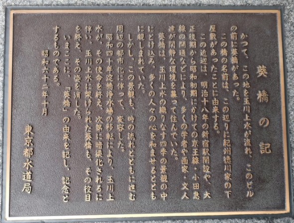 かつて、この地を玉川上水が流れ、このビルの前に葵橋があった。この橋の名前は、この辺りに紀州徳川家の下屋敷があったことに由来する。この付近は、明治十八年の新宿駅開設や、大正後期から昭和初期にかけての京王線・小田急線の開通などにより、多くの学者や画家・文人達が閑静な環境を慕って住んでいた。葵橋は、玉川上水の織りなす四季の景観の中にとけ込み、多くの人々の心を和ませるとともに親しまれていた。しかし、この景観も時の流れとともに進む周辺の都市化に伴って変容した。昭和四十年淀橋浄水場の移転により、玉川上水がその使命を終え、次第に暗渠化されるに伴い、玉川上水に架けられた葵橋もその役目を終え、その姿を消した。いまここに「葵橋」の由来を記し、記念とするものである。