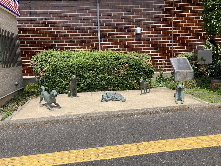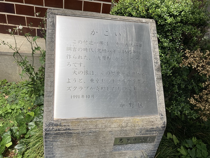 この付近一帯は、徳川五代将軍綱吉の時代(元禄八年:1695年)に作られた、「犬屋敷」があったところです。犬の像は、その歴史を語り伝えようと、東京セントラルライオンズクラブが寄贈したものです。