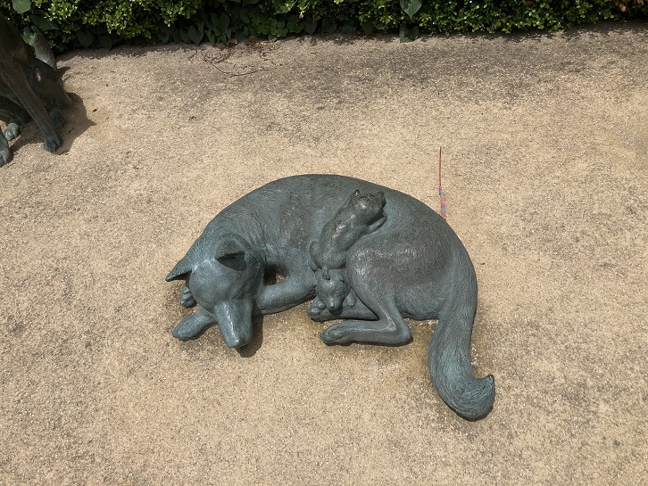 中野区役所の敷地の奥に、中野犬屋敷跡のモニュメントが展示されています。全部で10万頭も収容されていたといいますから、この親子のように繁殖するスピードも半端なかったことでしょう。