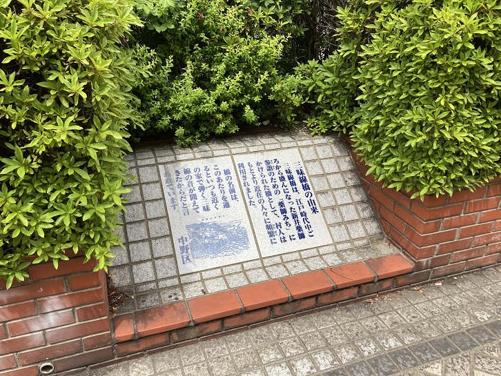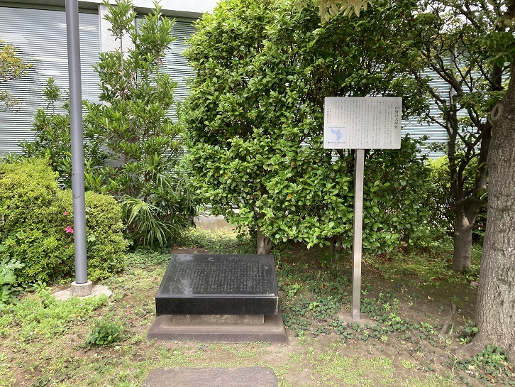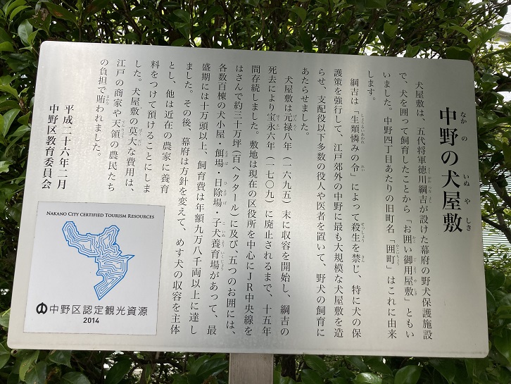 その脇に、犬屋敷の顛末を記した案内板と、中野区の歴史と区役所庁舎建設の経緯を述べた記念碑があります。