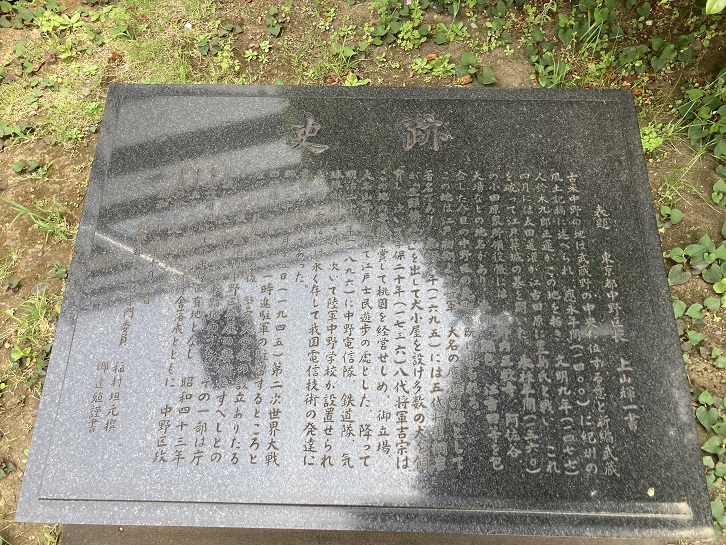 スタート地点の中野四季の森公園から歩き始めます。中野四季の森公園は、中野四丁目にあった警察大学校等の跡地を再開発した約16.8ヘクタールにも及ぶ「中野四季の都市」(「なかの新都心」などと呼ばれることもあります)の敷地の中央部にできた防災機能を備えた公園で、その面積は約1.5haあります。中野四季の都市の敷地内には、オフィスビルや早稲田大学・明治大学・帝京平成大学のキャンパス、それに東京警察病院などもあり、中央に位置する中野四季の森公園はオフィスビルで働く人や大学キャンパスの学生など多くの人に利用され、中野にぎわいフェスタなどの大型イベントも催されています。この地は、江戸時代に生類憐れみの令で有名な五代将軍徳川綱吉が設けた野犬保護施設である「お囲い犬屋敷」がありました。中野四丁目の旧名「囲町」はこれに由来しています。この屋敷の広さは、現在の中野区役所付近を中心として、中野四季の都市を含めた約30万坪もの土地になり、生類憐れみの令で殺生が禁じられた野犬の保護が行われていました。この施設は元禄八年(1695年)から綱吉の死去によって宝永六年(1709年)に廃止されるまで続きました。その後徳川吉宗の時代になるとお囲い跡の一部に桃の木が植えられ、「桃園」という名前で江戸市民に親しまれたといいます。明治時代になると、中野四季の都市のある一帯は陸軍の施設が置かれました。一帯には陸軍の鉄道隊・電信隊・気球隊が明治三十年(1897年)に置かれ、後に交通兵団司令部も置かれました。その後、鉄道隊・気球隊が千葉県に移り、ここには第一電信連隊と称する電信隊のみが置かれました。昭和十四年(1939年)には、陸軍中野学校が移転・開設されました。戦後、跡地には警察大学校と警視庁警察学校が置かれ、平成十三年(2001年)まで使われました。警察学校などが府中市に移転した後、跡地の再開発がなされ、中野四季の都市が誕生しました。中野四季の森公園を含む中野セントラルパーク地区には、2棟の高層オフィスビルが建ち、キリンホールディングス本社が移転してきて話題になりました。