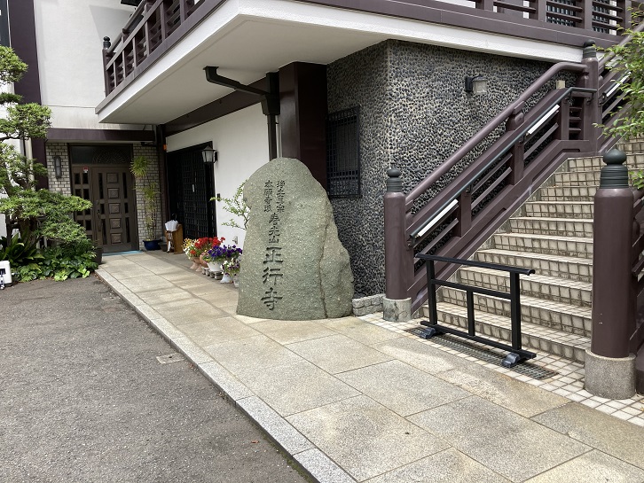 今回のコースでは桃園川緑道は三味線橋から北裏橋までのごく短い区間だけしか通りません。北裏橋で右折して桃園川緑道を離れ、住宅地の中の路地を進みます。右手奥に正行寺があります。昭和十二年(1937年)に開山され、開祖は代々浄土真宗の教えを広める家系出身の釋行雄でした。現在の南台に久遠山教会を設立したのが正行寺の起源です。昭和二十年(1945年)の空襲で久遠山教会が焼失したため、現在の弥生町に移転し、正行寺の寺号を公称しました。昭和三十年(1955年)に当地に移転しました。正行寺は比較的新しい寺ということから、「心地よく仏さまと向き合えるお寺をめざして」の理念の下、本堂にいち早く冷暖房設備(暖房は床暖房)を導入したり、畳でなく椅子席とするなど様々な工夫を凝らしています。