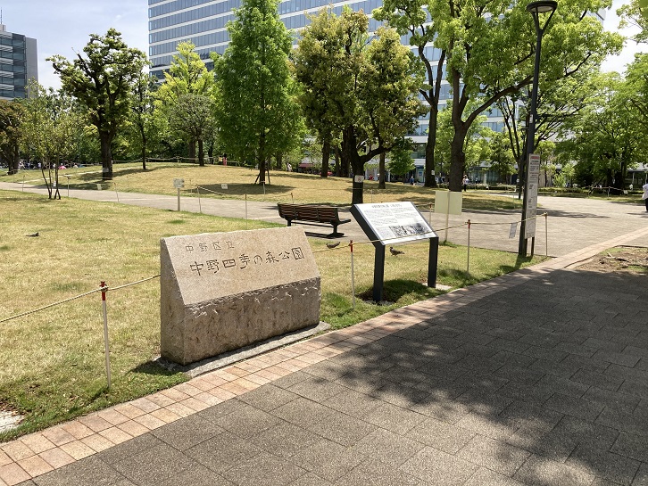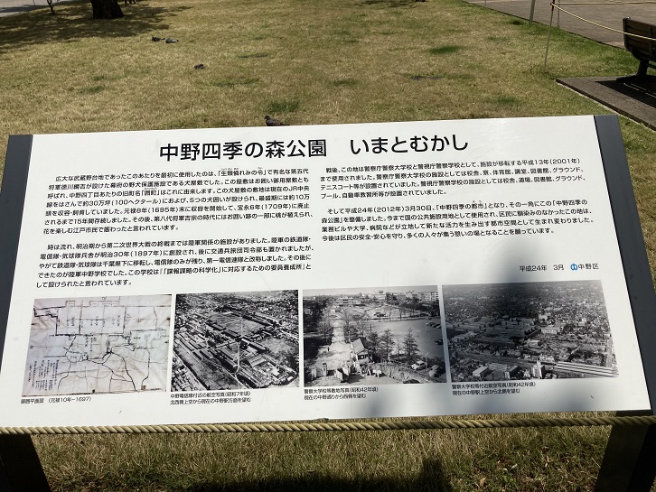 そして平成二十四年(2012年)3月30日、「中野四季の都市」となり、その一角にこの「中野四季の森公園」を整備しました。今まで国の公共施設用地として使用され、区民に馴染みのなかったこの地は、業務ビルや大学・病院などが立地して新たな活力を生み出す都市空間として生まれ変わりました。今後は区民の安全・安心を守り、多くの人々が集う憩いの場となることを願っています。