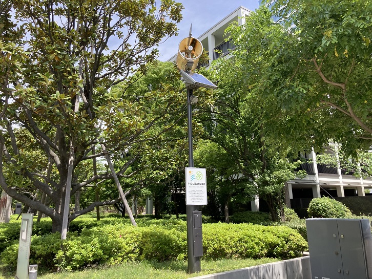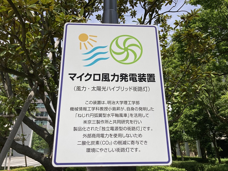 この装置は、明治大学理工学部機械情報工学科教授小島昇が、自身の発明した「ねじれ円弧翼型水平軸風車」を活用して(株)京三製作所と共同研究を行い製品化された「独立電源型の街路灯」です。外部商用電力を使用しないため二酸化炭素(CO2)の削減に寄与でき環境にやさしい街路灯です。
