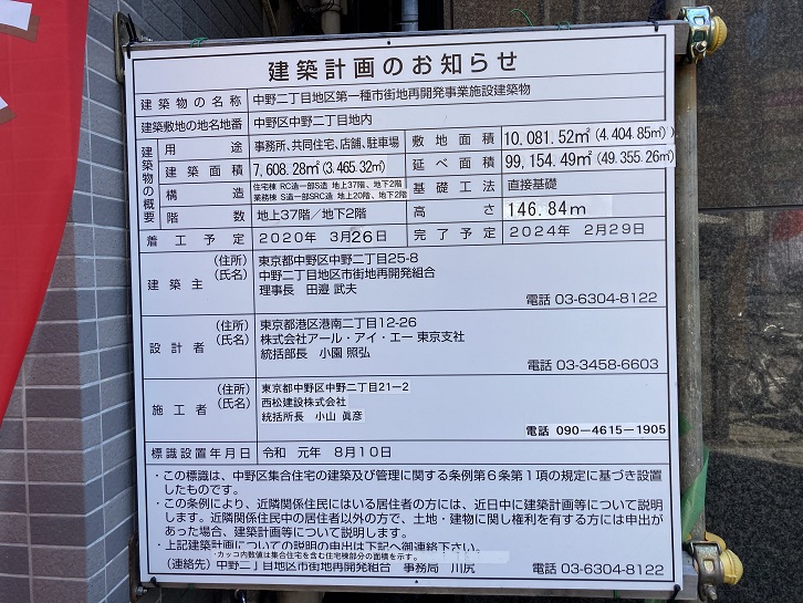 中野駅前の再開発は北側だけでなく、南側でも進行中です。昭和二十七年(1952年)に建設された「公社中野住宅」は令和元年(2019年)に建替えられて「コーシャハイム中野フロント」に生まれ変わりました。また、残りの跡地は「中野二丁目地区市街地再開発事業」と「中野二丁目土地区画整理事業」が一体的に進められていて、超高層オフィスビルと超高層マンションが建ち、公園や道路・駅前広場なども整備されることになっています。