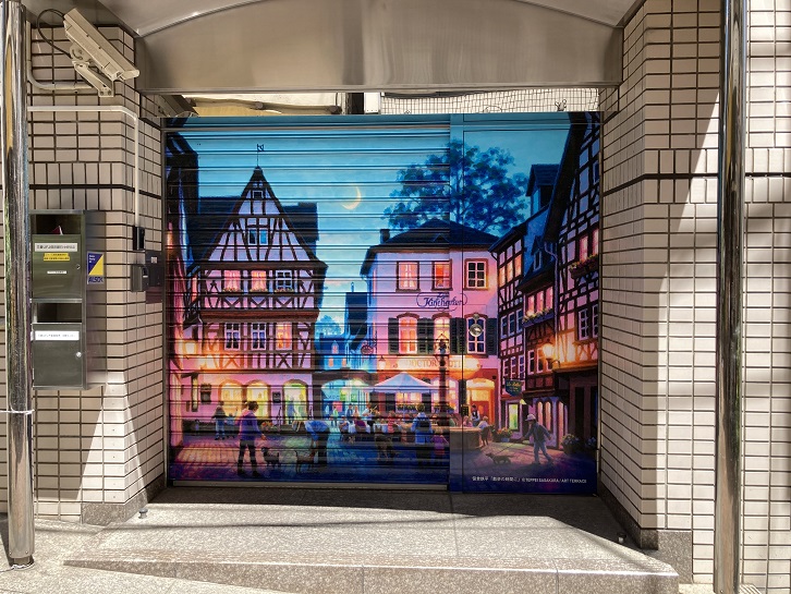 レンガ坂では、2020年11月1日から2021年1月18日まで、期間限定のアートシャッターストリートが開催されました(5月3日時点でも店舗のアートシャッターは残っていますが)。店舗10ケ所のシャッターに「光の情景画家」としても知られている人気のアーティストの笹倉鉄平さんのアートが描かれて(貼られて)います。多くの飲食店がシャッターを閉めている昼間の顔と、イルミネーションが印象的だが一般店舗がシャッターを閉めている夜の顔があるので、シャッターにレンガ坂のイメージに合ったアートを施し、コロナ禍に負けないようさらなる賑わいと癒やしのストリートを生み出したいと思いから実現しました。笹倉さん本人が店ごとの雰囲気に合わせてシャッターに貼る絵を選定したということです。シャッターに直接描けば落書きになりますが、シートに描かれた絵をシャッターに貼付けたんですね。バスの車体の全面広告も同じようなやり方をとっているのでしょう。人に隠れて落書きをする輩もこれくらいの気遣いをしてくれるといいのですが。