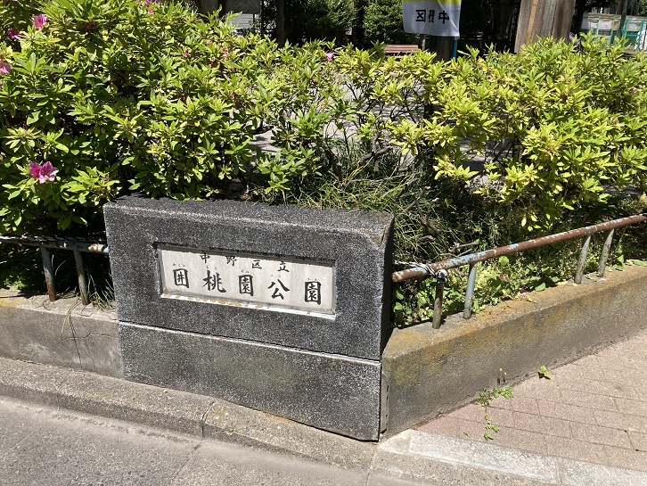 桃園通りを更に進みますと、囲桃園公園という、桃園通りに面した珍しい名前の公園があります。今は深緑の季節ですが、園内には桜の木が植樹されていて、春には満開の桜の下でお花見が楽しめます。「囲桃園公園」の「囲」は、江戸中期に東京ドーム20個分にも及ぶ広大な野犬保護施設「御囲場」があったことに由来します。現在の中野サンプラザや中野ザ・ポケットがある地域は全てこの御囲場のあったところです。その広大な敷地を5つに分け、全部で10万頭もの野犬をまとめて飼育していたそうです。しかし、この法令は、綱吉の死後、六代将軍家宣に仕えた新井白石によってすぐに廃止されてしまいます。「囲桃園公園」の「桃園」は、江戸時代に徳川家八代将軍吉宗がこの地を気に入って桃の木を大量に植えさせ、その一帯を桃の名所にしたということで「桃園」と呼ばれた名残です。今の季節は藤棚が見ごろを迎え、秋にはもみじの紅葉も楽しめます。