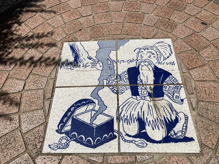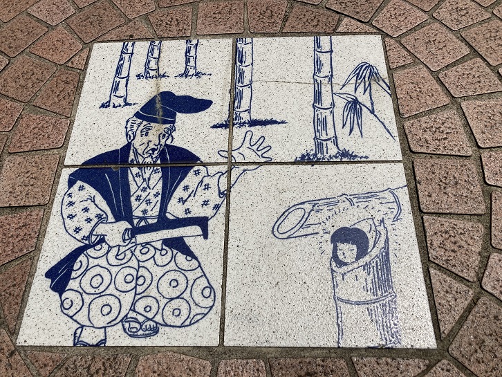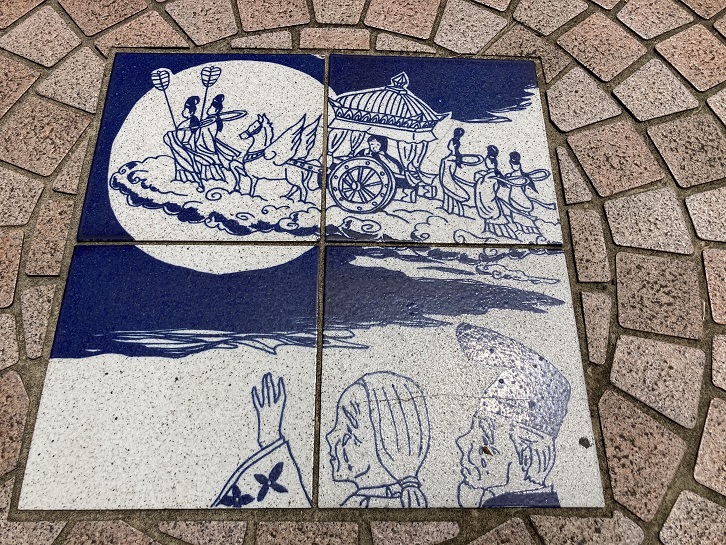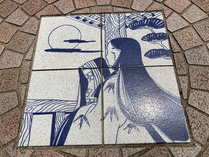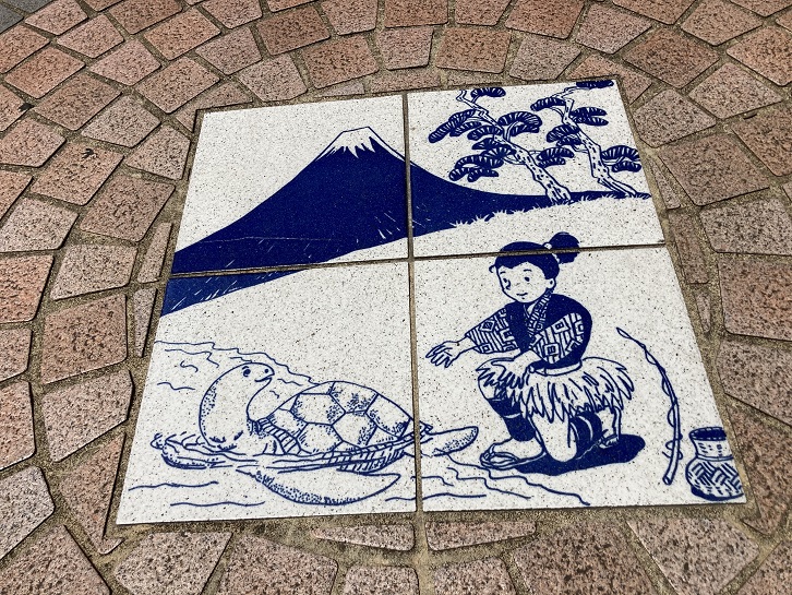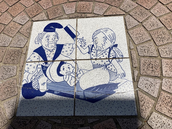 桃園川緑道の路面には、中野駅から東中野方向に向って、桃太郎・浦島太郎・かぐや姫の昔ばなしが描かれたタイルが貼られています。浦島太郎のタイル絵は物語の逆順になっていますのでご注意。