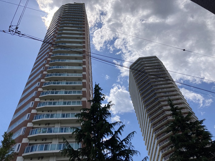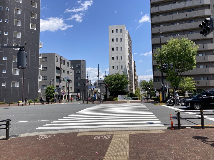 神田川沿いの遊歩道はこの先も続きますが、大東橋で神田川から離れ、東中野のランドマークである2棟のタワーマンション横を通ります。かって東中野には広大な敷地を構えていた日本閣があり、結婚式場として有名でした。その跡地の東半分を再開発した場所に2007年に竣工したのがこのユニゾンタワー東中野とパークタワー東中野という名称のマンションです。