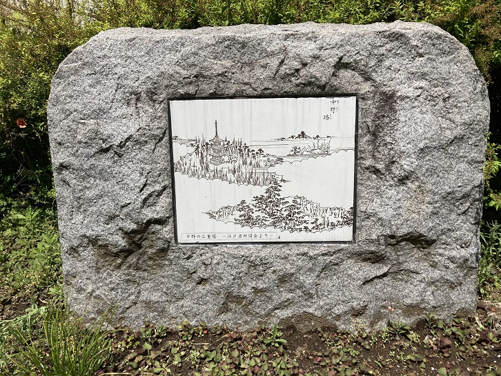 緑道の脇に「中野の三重塔」と記された石碑が置かれています。中野塔は宝仙寺の昔の境内敷地(現在の境内からは200メートルほど離れた中野区立第十中学校の校庭付近)に建っていたことから、宝仙寺三重塔とも呼ばれていました。寛永年間(17世紀前期〜中期)の建築で、高さ24メートルで、屋根は檜皮葺でした。江戸近郊で唯一の三重塔でしたが、昭和二十年(1945年)5月の大空襲で焼失しました。残されている写真や実測図から、池上本門寺五重塔や上野寛永寺五重塔と並んで、江戸時代初期の典型的な建造物だったことがわかります。