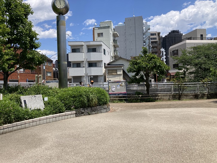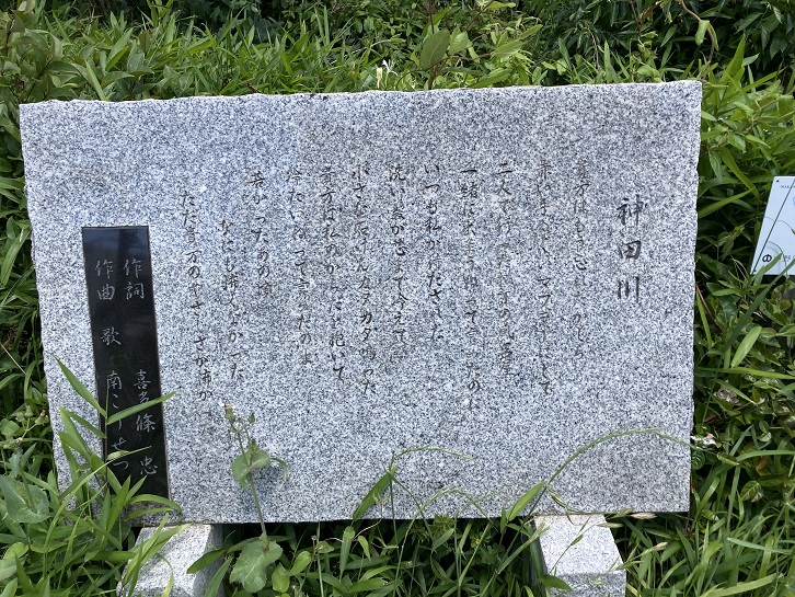 桃園川緑道の終点は小さな広場になっていて、広場の隅にはかぐや姫の定番ソングである「神田川」の歌碑が置かれています。神田川は目の前に流れていますが、歌詞の内容からしてこの場所は関係ないようです。