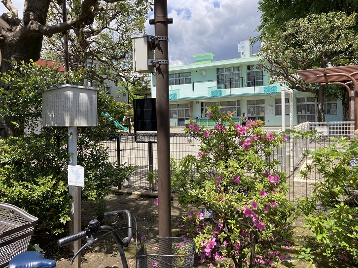 本五ふれあい公園と隣の中野二中の敷地を合わせて防災機能を持たせているそうです。フェンスに囲まれた中野二中の敷地の角に古ぼけた時計台(換気塔?)が建っています。張り紙には次のような説明が記されています。
