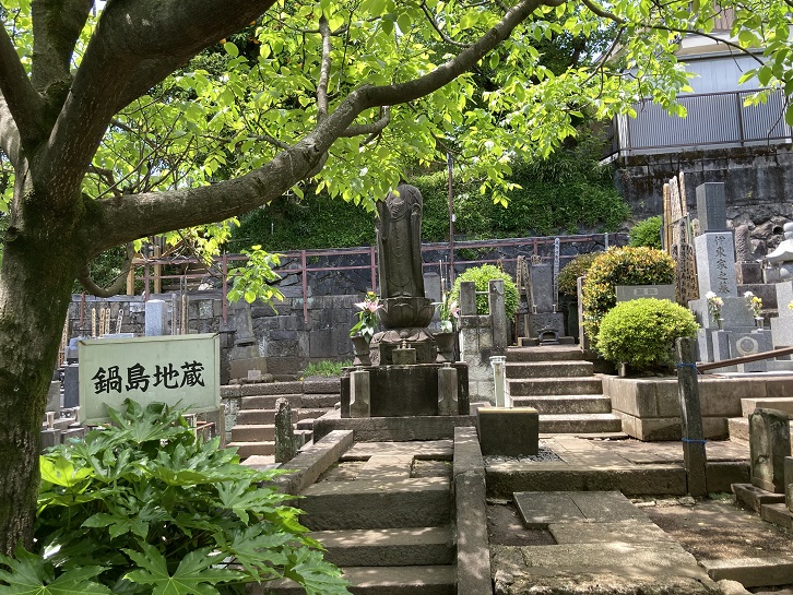 墓地に入っていきますと、鍋島地蔵が門番のように石段の前に立っています。墓地の奥まったところには鍋島家の墓所があります。