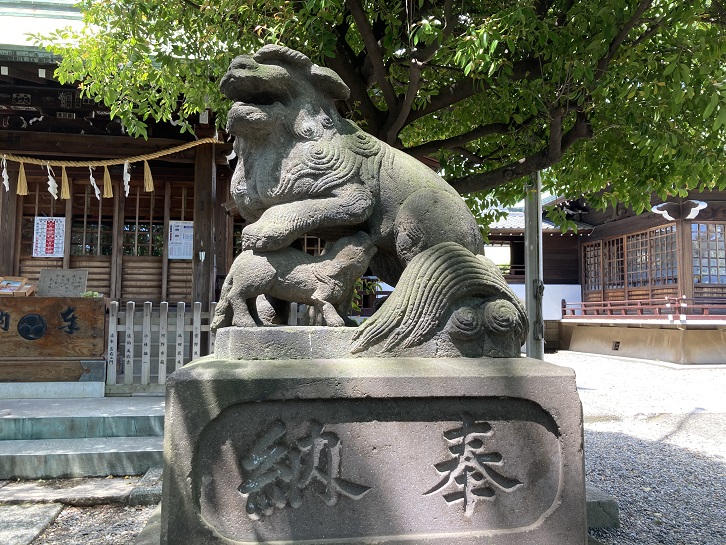 本堂の前には一対の狛犬が鎮座していますが、どちらも子供と一緒です。右側は阿形の狛犬ですが、珍しく授乳している姿ですね。左側の吽形の狛犬は子供をあやしているように見えます。この狛犬夫婦は子育て中なのでしょうか。
