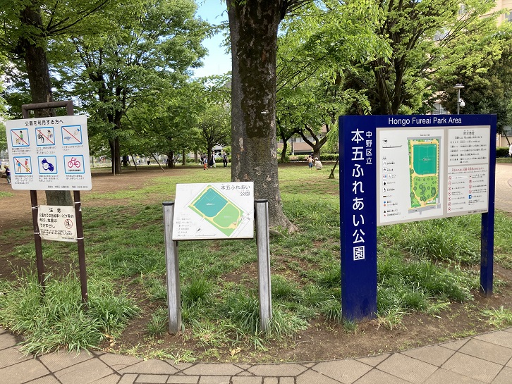 中野通りに面して本五ふれあい公園があります。広い運動場や芝生が拡がる緑溢れる公園です。私がお散歩に持ち歩いている10年前の地図には公園の名前は見当たりません(さっさと買い換えろ!)。実は、中野区が企業の社宅跡地を取得し、平成二十八年(2016年)に開園したのだそうです。都心に新しく造成された敷地面積1.2ヘクタールにも及ぶ公園は珍しいのではないでしょうか?