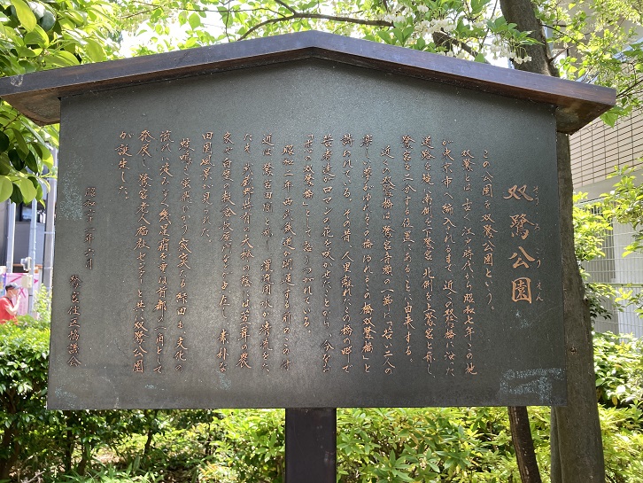この公園を双鷺公園という。双鷺とは、古く江戸時代から昭和七年この地が東京市へ編入されるまで、近くの双鷺橋に沿った道路を境に南側を下鷺宮、北側を上鷺宮と称し、鷺宮を二分する位置にあることに由来する。近くの双鷺橋は、鷺宮音頭の一節に「若い二人の楽しい夢がゆれるこの橋 ゆれるこの橋双鷺橋」と詩われている。その昔、人里離れたこの橋の畔で若者達がロマンの花を咲かせたことから、今なお「恋の双鷺橋」として語りつがれている。昭和二年西武鉄道が開通する前のこの付近は、鷺宮田圃と称し、灌漑用水が清流をたたえ、武蔵野特有の大黷フ陰には萱葺きの農家や白壁の穀倉長屋門などが点在し、素朴な田園風景が見られた。蛙鳴き蛍飛びかう寂寞たる緑田も、文化の流れに淀みなく幾星霜を重ね首都の一角として発展し、鷺宮老人福祉センターと共に双鷺公園が誕生した。