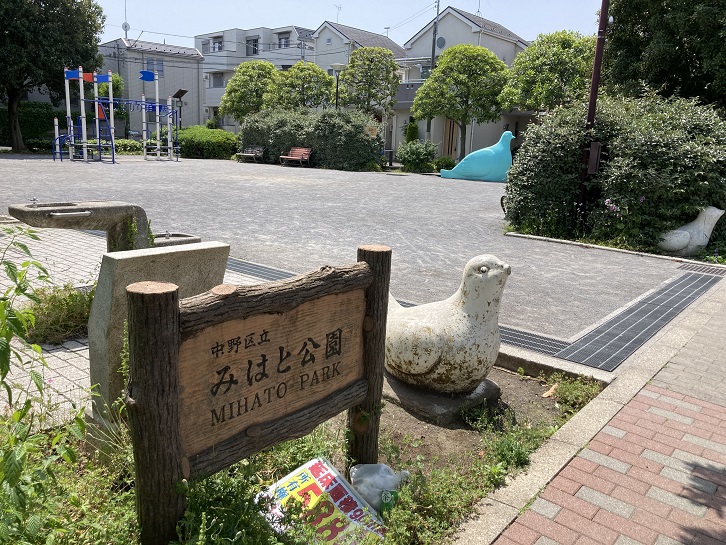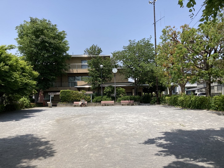 公園は閑静な住宅地にあり、周囲には木々が植えられ、初夏の風が涼しそうです。でも、ベンチには木陰は届かず、おじさんは日光浴をしているのでしょうか?公園に隣接して鷺宮すこやか福祉センターがあります。障害者支援・地域の生活支援、それに高齢者向けの施設も備わっています。