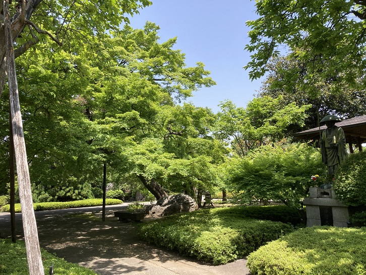 福蔵院は、秋には素晴らしい紅葉を見せる楓の木でも知られています。普通、紅葉といえばモミジですが、モミジという呼び方は日本特有のもので、どちらも同じカエデ属の植物です。違いといえば、日本では楓の中でも特に真っ赤に色づく種類をモミジ、その他は楓と呼んでいるのです。また、境内には推定樹齢350年とされる花梨(カリン)の木があります。花梨の木も紅葉が美しく、古くから庭木として愛されてきました。そんな歴史を感じさせる福蔵院の秋の光景に目を奪われることでしょう。残念ながら今は新緑の季節ですが。
