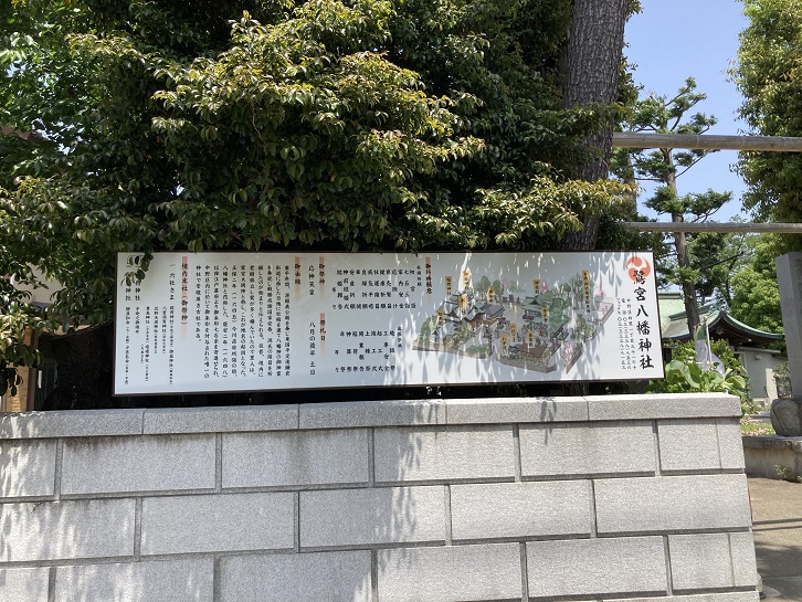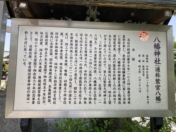 福蔵院に隣接して鷺宮八幡神社があります。塀の上に掲げられた長大な案内板には、神社の由緒が書かれています。