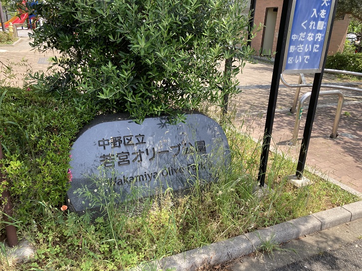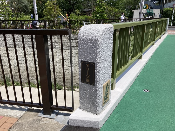 オリーブ橋を渡って妙正寺川の対岸に出ます。橋の先に若宮オリーブ公園があります。オリーブ橋とかオリーブ公園という名前は珍しいですね。何故オリーブという名前が付けられたのかといいますと、近くにオリーブで有名な小豆島を舞台にした「二十四の瞳」の作家壺井栄が住んでいたからということだそうです。公園にはオリーブの木が植えられているとのことですが、植物に疎い私にはどの木がそうなのか分かりませんでした。ちなみに、橋の欄干にはオリーブの枝の切り絵が添えられています。