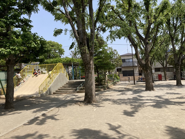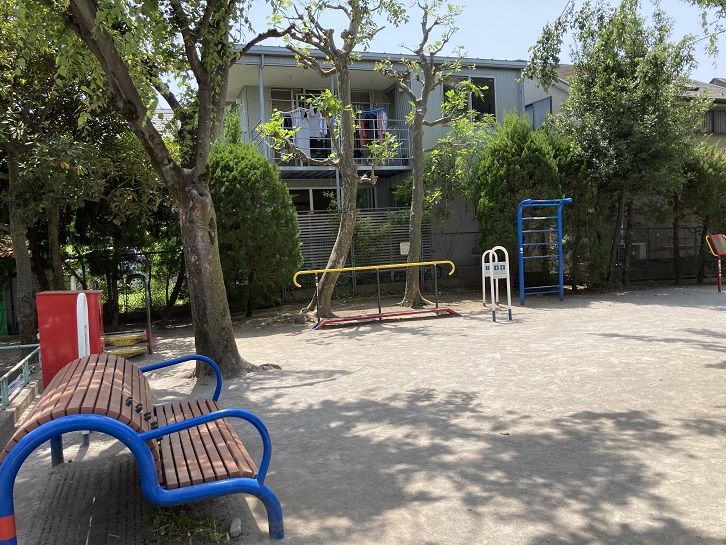 公園の中には、ブランコやすべり台・鉄棒・砂場などの定番の施設が備わっています。4連のブランコは囲いもあって、安全性も考慮されていますね。すべり台には端っこに突起が付いていますので、滑り終えても直ぐに上に上がれます。よく考えられた作りです。