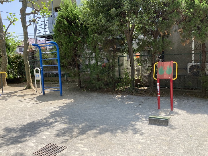 子供向けの遊具の他に、最近各地の公園に見られる健康器具も備わっています。腕立てボード・ろく木・そろそろ平均台・ゆったりステップ・背のばしベンチなどなど。使い方や効能を説明したボードがあれば尚いいのですが。