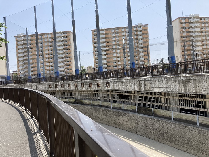 調節池というのは、大雨で妙正寺川の水量が増したときに、地下に造られた貯水施設に一時的に川の水を取り込み、増水が収まった後で、貯めた水を川に戻す働きをします。妙正寺川の護岸には増水した水を取り込むための取水口が幾つも並んでいます。
