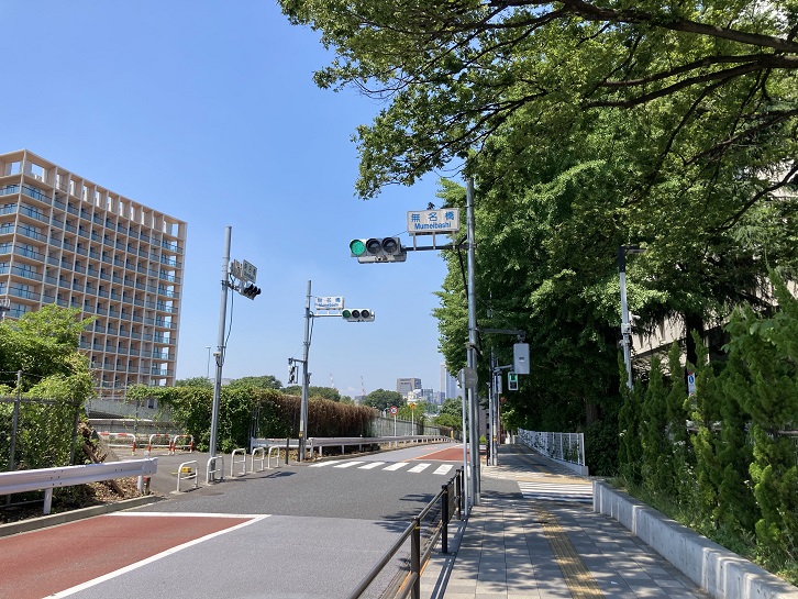 中央線の線路に沿って、慶應大学病院の脇の道路を進みます。慶應病院の敷地が途切れるところに無名橋交差点があります。無名橋は中央線の上空を跨ぎ、首都高速4号新宿線をくぐる歩行者・自転車専用の陸橋です。橋名からしていわれのある橋のように思えますが、名前が付けられた経緯は不明とのことです。