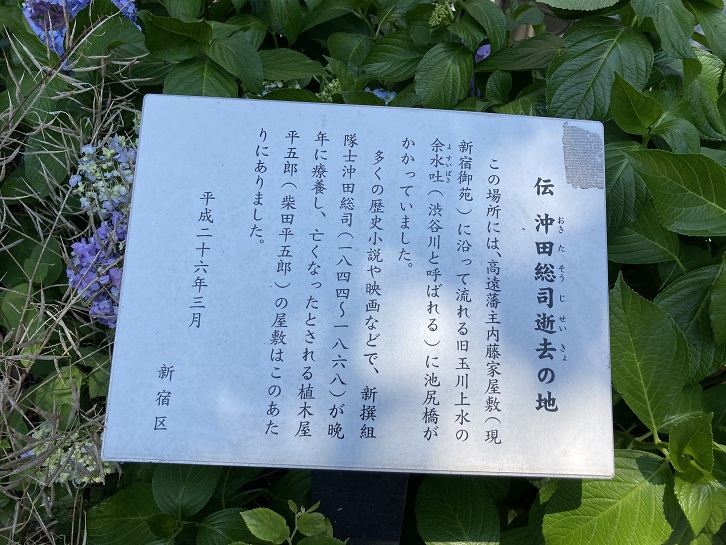この場所には、高遠藩主内藤家屋敷(現新宿御苑)に沿って流れる旧玉川上水の余水吐(渋谷川と呼ばれる)に池尻橋がかかっていました。多くの歴史小説や映画などで、新撰組隊士沖田総司(1844年〜1868年)が晩年に療養し、亡くなったとされる植木屋平五郎(柴田平五郎)の屋敷はこのあたりにありました。